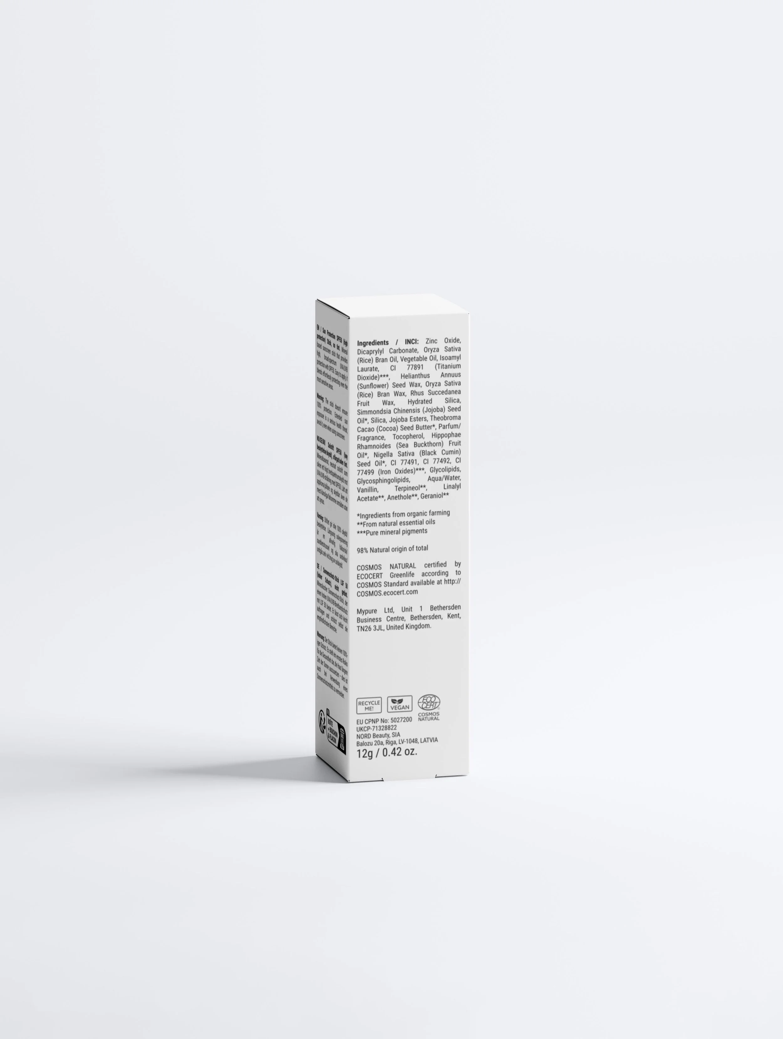 Zinc Oxide, Dicaprylyl Carbonate, Oryza Sativa (Rice) Bran Oil, Vegetable Oil, Isoamyl Laurate, CI 77891 (Titanium Dioxide)③, Helianthus Annuus (Sunflower) Seed Wax, Oryza Sativa (Rice) Bran Wax, Rhus Succedanea Fruit Wax, Hydrated Silica, Simmondsia Chinensis (Jojoba) Seed Oil①, Silica, Jojoba Esters, Theobroma Cacao (Cocoa) Seed Butter①, Parfum/Fragrance, Tocopherol, Hippophae Rhamnoides (Sea Buckthorn) Fruit Oil①, Nigella Sativa (Black Cumin) Seed Oil①, CI 77491, CI 77492, CI 77499 (Iron Oxides)③, Glycolipids, Glycosphingolipids, Aqua/Water, Vanillin, Terpineol②, Linalyl Acetate②, Anethole②, Geraniol②